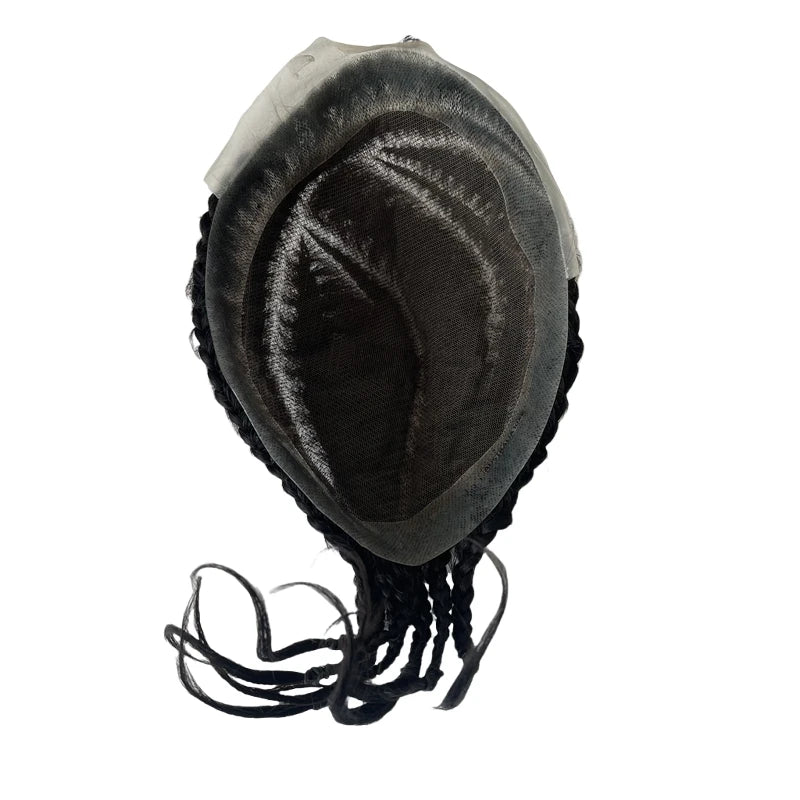 Brasilian neitsythiustoupee, cornrow-palmikkohiukset 8x10, keskellä pitsi, PU-reunus, mustille miehille