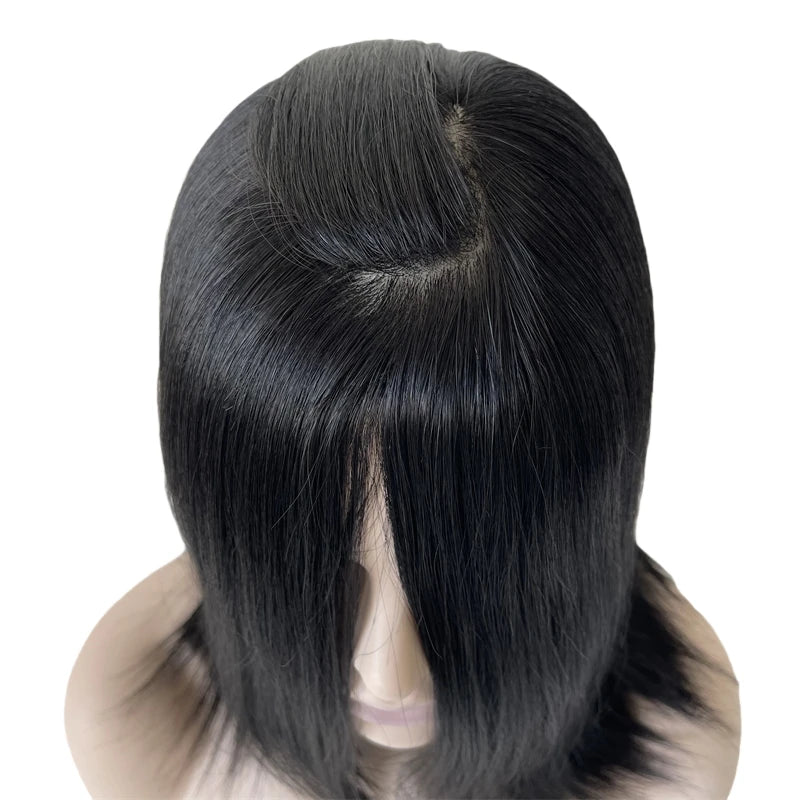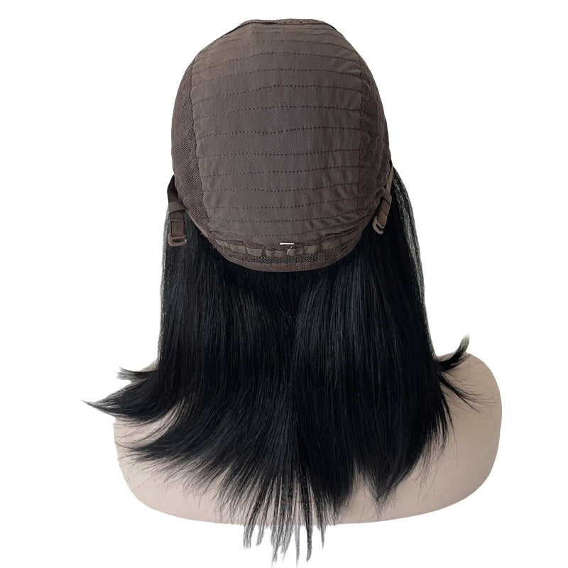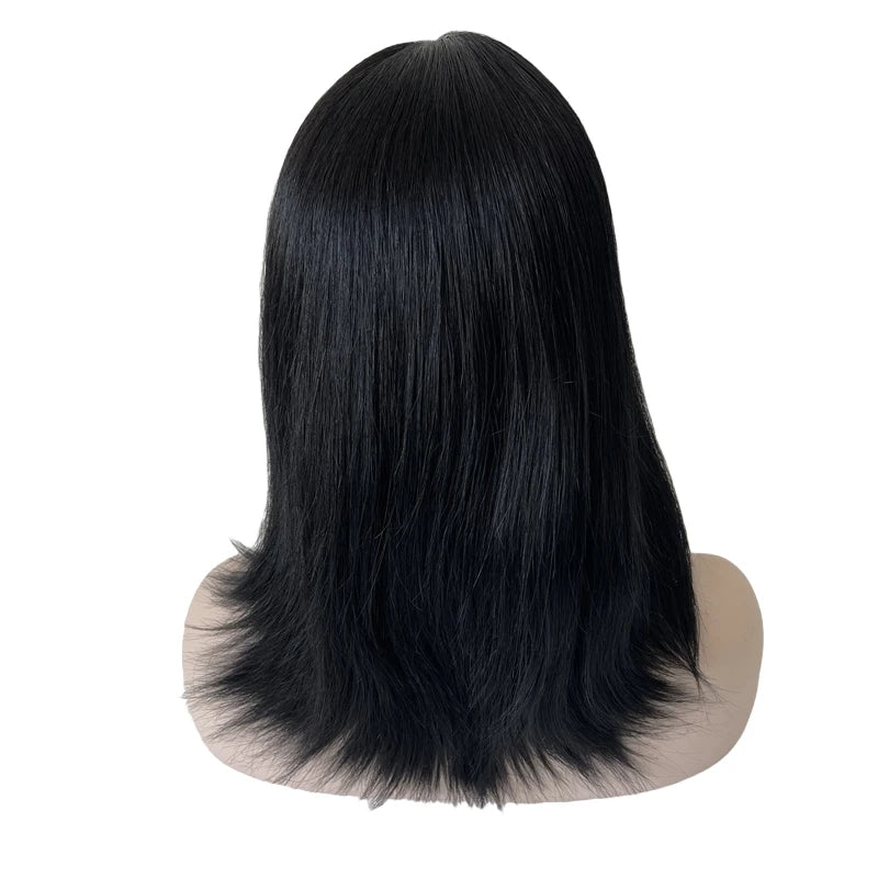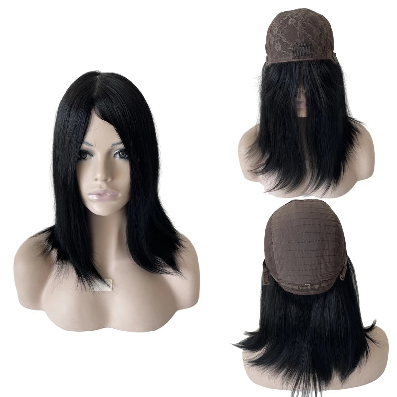 16" Maláj szűz emberi hajból készült fekete kóser paróka, 130% sűrűségű, selymesen egyenes, 4x4 selyem felső résszel